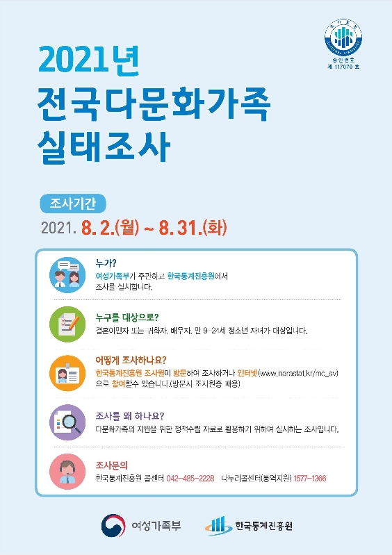 | 8 | 2021년 전국다문화가족 실태조사 실시 | 2021-07-12 | 조사총괄본부 | 2039 |